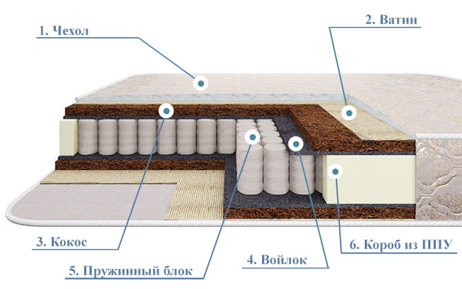 1. Чехол. На выбор можно заказать из двух разных тканей: жаккард стеганый или стеганый хлопок. Материалы и технологии изготовления разные. Однако разработаны они специально для матрасов. Поэтому обладают всеми необходимыми свойствами: не вызывают аллергию, пропускают воздух и обладают необходимой способностью отводить влагу, чтобы человек не потел во время сна.