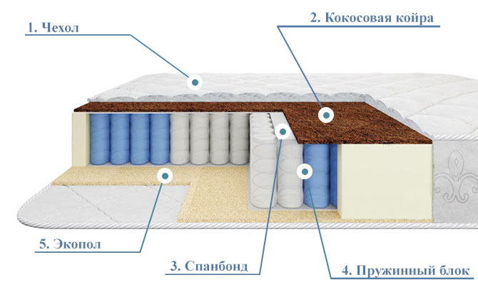 - Экопол. Нижний слой матраса выполнен из сизаля, природного долговечного и прочного материала, который обладает отличными теплоизолирующими свойствами.