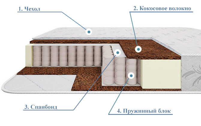 2. Кокосовое волокно (9 мм). Природный материал с добавлением натурального латекса обладает высокой эластичностью, за счет которой ортопедические свойства матраса увеличиваются в разы. Кроме этого наполнитель не впитывает влагу, улучшает воздухообмен, препятствует появлению клещей и прочих микроорганизмов.