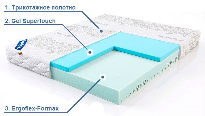 - GEL Supertouch. Слой инновационной пены обладает эффектом памяти, легко и быстро повторяет форму тела. Обладает термочувствительными и терморегуляционными свойствами. Благодаря этим качествам матрас всегда обеспечивает комфортную для владельца температуру. Излишнюю поглощает летом, а в холодное время года сохраняет ее.