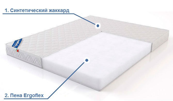 1. Чехол Есо (2 см). Плотная жаккардовая ткань, стеганая с файбером, прекрасно защищает основу матраса от пыли и влаги, держит тепло в холодную погоду. Синтетический материал (состав 50% полиэстер / 50% пропилен) не электризуется, не растягивается, сохраняет долгое время внешний вид матраса.