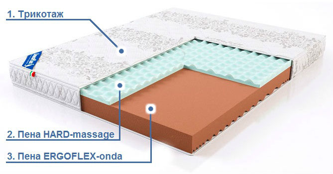 2. Пена HARD-massage (5 см). Этот слой придает матрасу жесткость выше среднего уровня. Спать на этой стороне матраса рекомендуется при проблемах с осанкой. Наполнитель дает хорошую опору, позвонки фиксируются в правильном положении. Вы можете улучшить состояние верхнего отдела позвоночника и избавиться от болей в шее. Матрас отлично подходит тем, кто любит спать на животе. Жесткая поверхность помогает принять пояснице естественное положение, не дает ей излишне прогнуться, что позволяет отдохнуть во время сна без лишнего напряжения.