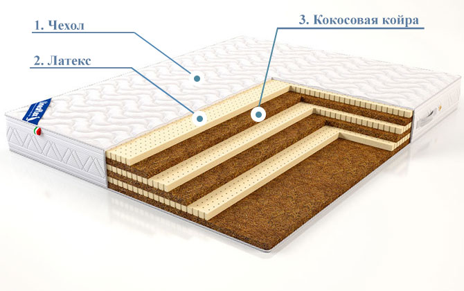 - Кокосовая койра ( 2 см — 2 слоя, 1 см — 1 слой). Наполнитель, пропитанный латексом в 50% пропорции, создает жесткую и упругую поверхность. Нагрузка оптимально распределяется по всему матрасу, за счет чего мышцы и суставы отдыхают правильно. Хорошая воздухопроницаемость позволяет защитить матрас от пыли, внутри изделия не задерживаются вредоносные микробы и не развиваются грибки. Матрас защищен, а значит защищены ваш сон и здоровье.