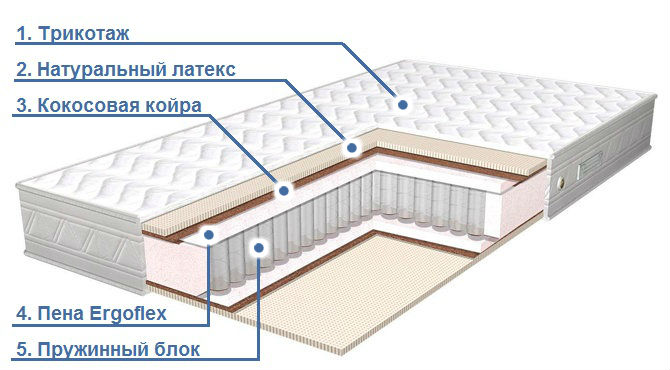 4. Пена ERGOFLEX (2 см). Высокоэластичный слой наполнителя увеличивает устойчивость всей конструкции, помогает избежать деформаций и увеличивает срок эксплуатации матраса. Способствует равномерному давлению пружинного блока на ваше тело.
